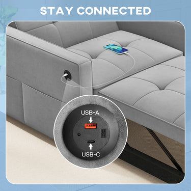 HOMCOM Convertible Chair Bed, Pull Out Sleeper Chair with USB, Adjustable Backrest, Small Velvet Futon Sofa Bed, Grey