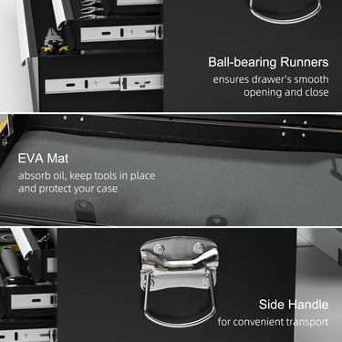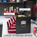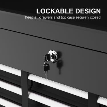 Discover the convenience of organising your tools with the HOMCOM Tool Chest. This lockable tool box features six drawers equipped with ball bearing runners for smooth operation, topped with a top case. Each storage space is equipped with EVA mats, providing effective protection for your tools as well as preventing scratches on the toolbox itself. The powder-coated steel frame offers a sleek look to this essential metal tool box, complete with side handles for easy mobility.