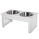 PawHut Deluxe Double Pet Dog Bowl Feeding Station Wooden Stand Pet Feeder Elevated Base Twin Bowls Stainless Steel, White