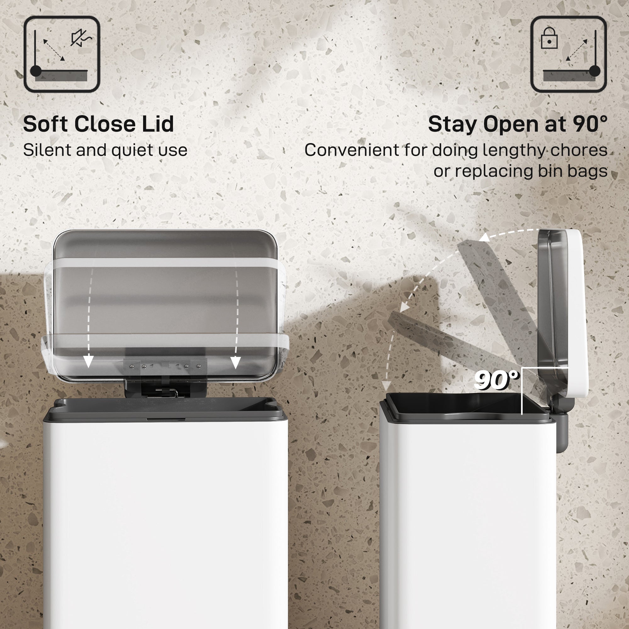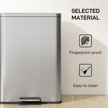 Tired of a bulky, noisy garbage can that clutters your space and demands constant cleaning? The disruptive slam of the lid shatters your peace, while smudges ruin your kitchen's clean look. The HOMCOM garbage bin solves this by fitting neatly into corners, closing silently for a tranquil home, and featuring a fingerprint-resistant finish. It brings a sense of calm and effortless order back into your daily life.