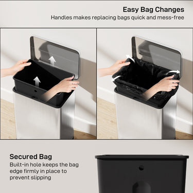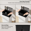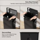 - • Features a built-in bag holder to keep liners securely in place