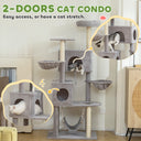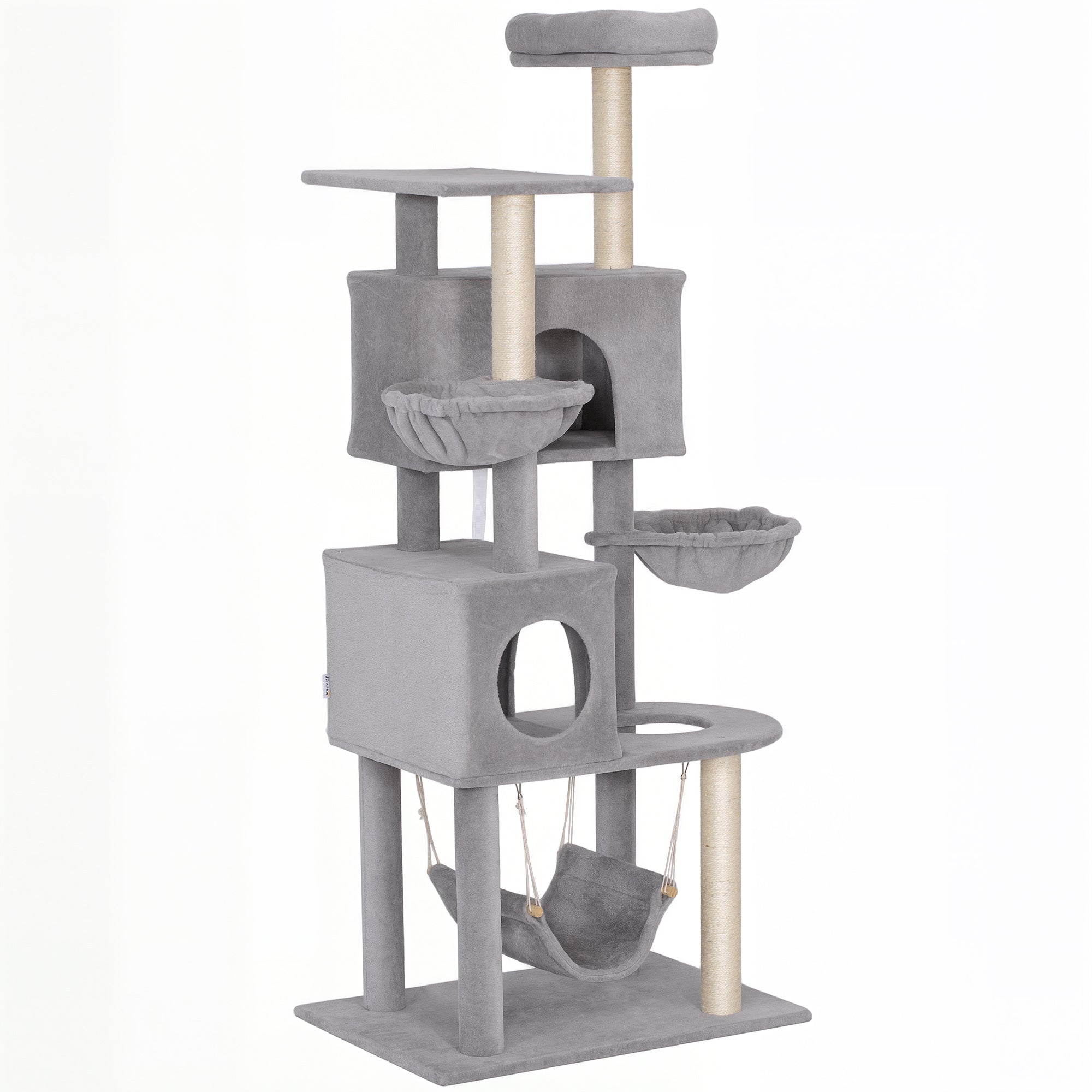 PawHut 66 Inch Large Cat Tree with 2 Door Condos, 3 Big Hammocks, Plush Top Perch, Sisal Scratching Posts, Light Grey