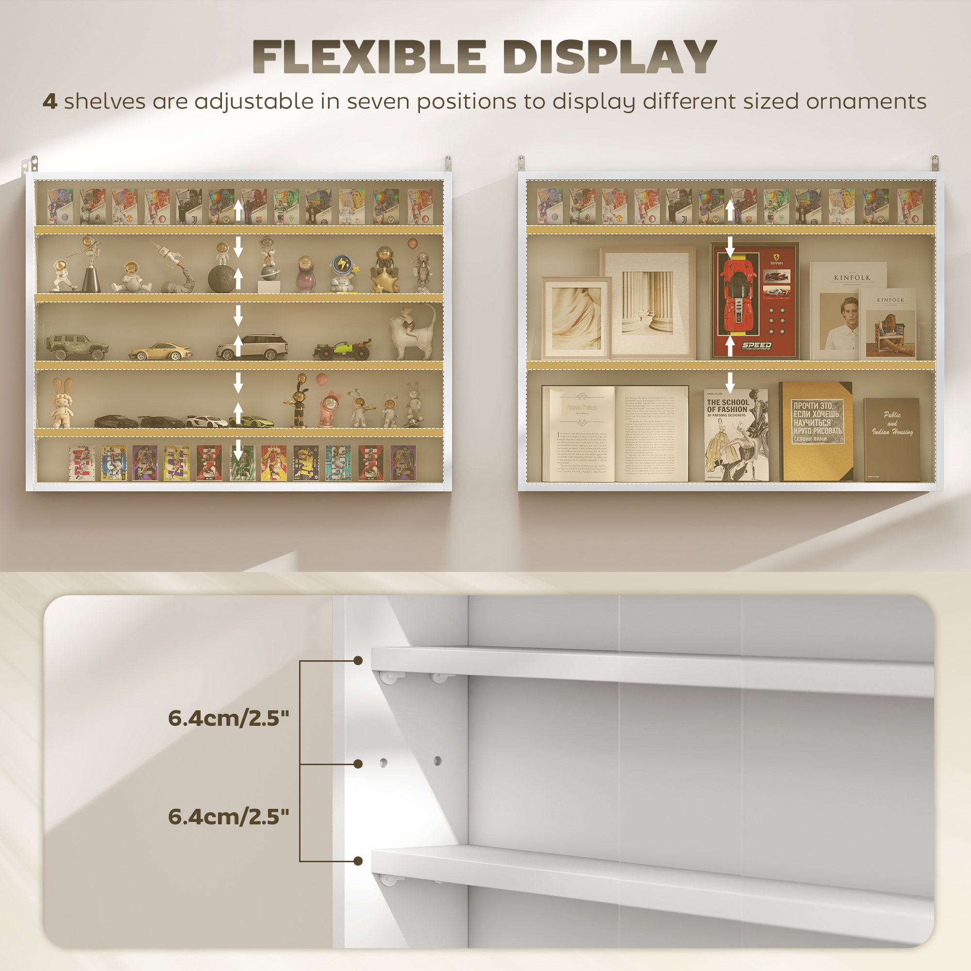 Do you have numerous small items you need help organizing? Do you have valuable souvenirs or collectibles you want to keep safe and on display? Our HOMCOM display case for collectibles is a great solution. Mounted on the wall like a closet, it features four adjustable shelves, allowing you to arrange your items in 5 neat layers. The large glass front door ensures everything is visible and easy to admire.