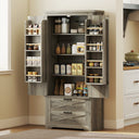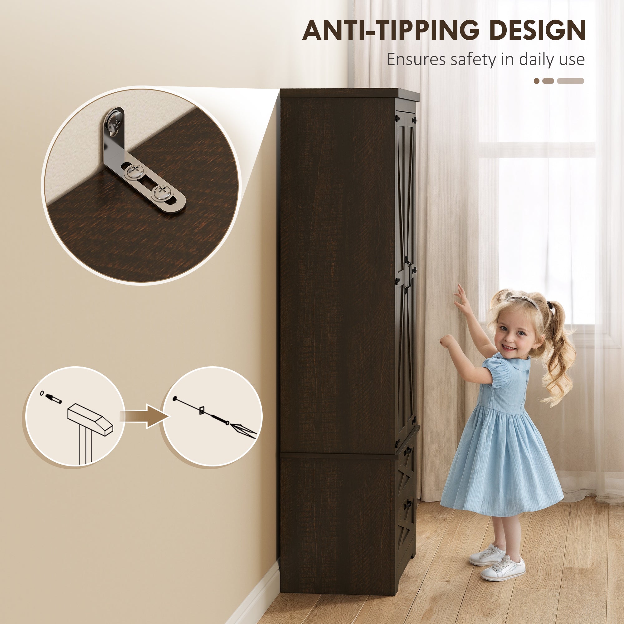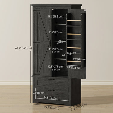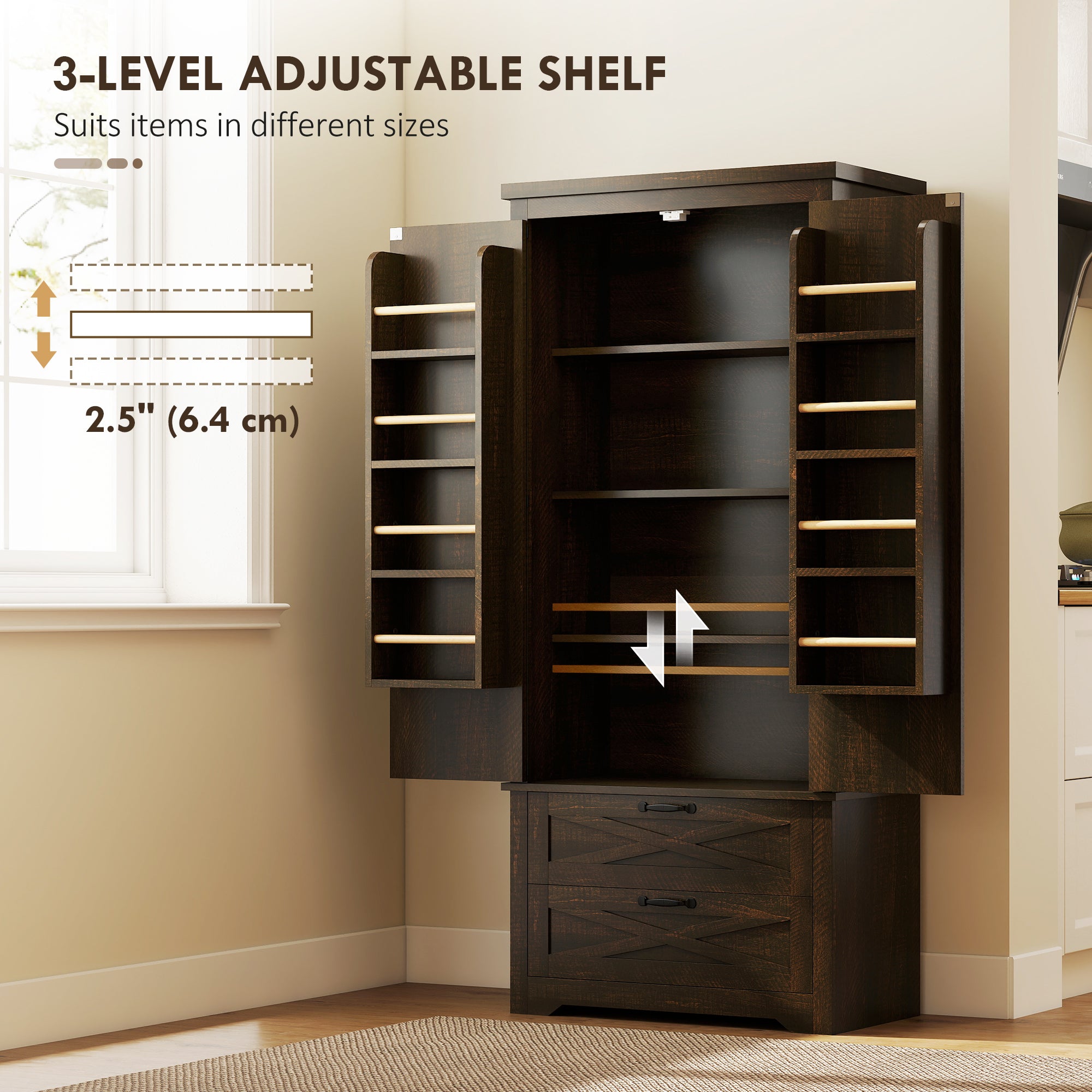 Add a touch of farmhouse flair to your kitchen with the HOMCOM kitchen pantry storage cabinet. Featuring a distressed white finish and charming barn doors, this kitchen pantry blends style with functionality. Organize effortlessly with a four-tier cabinet featuring adjustable shelves for flexible storage and two spacious drawers for tableware, along with eight door shelves for small items. Suitable for any kitchen needing extra storage with a hint of charm.