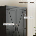 - • Distressed white pantry with barn doors and black accents exudes farmhouse charm