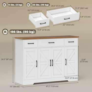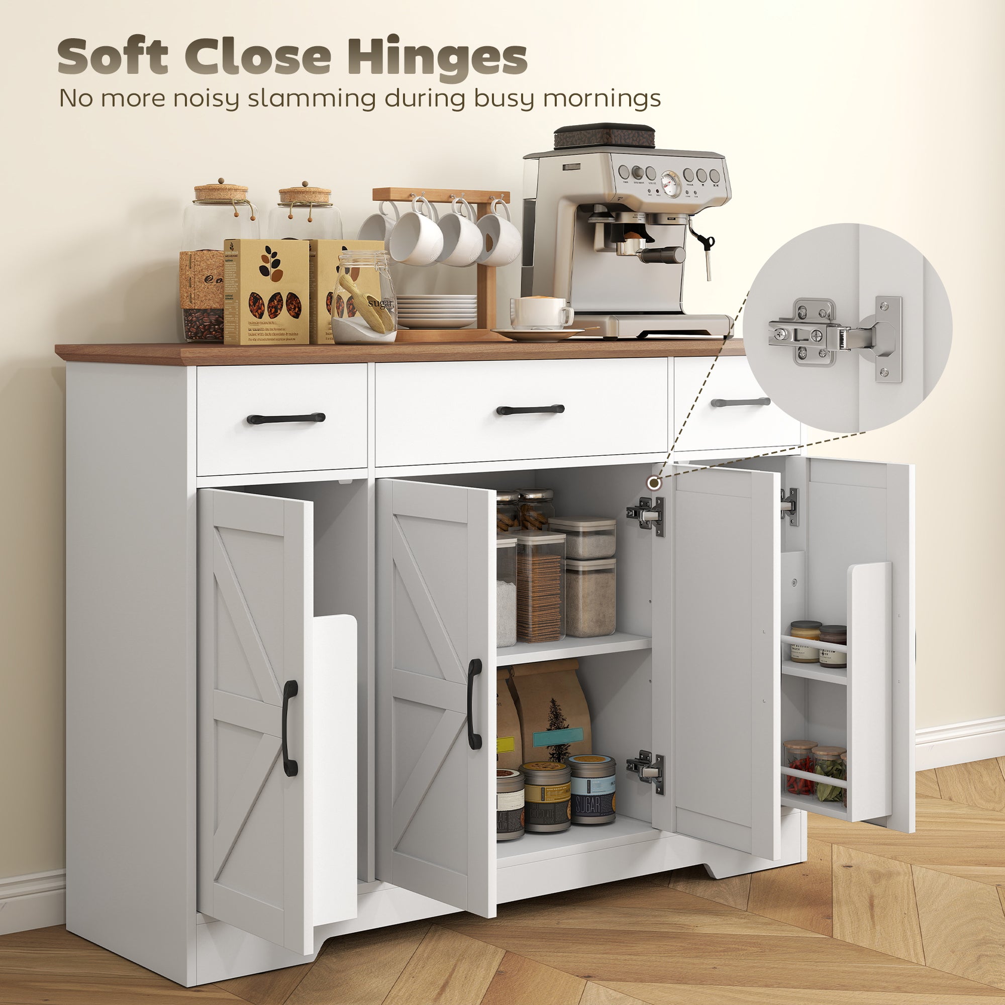 HOMCOM 47" Buffet Cabinet with Soft-Close Hinges, Farmhouse Sideboard with 3 Drawers, Adjustable Shelves and Spice Racks, White