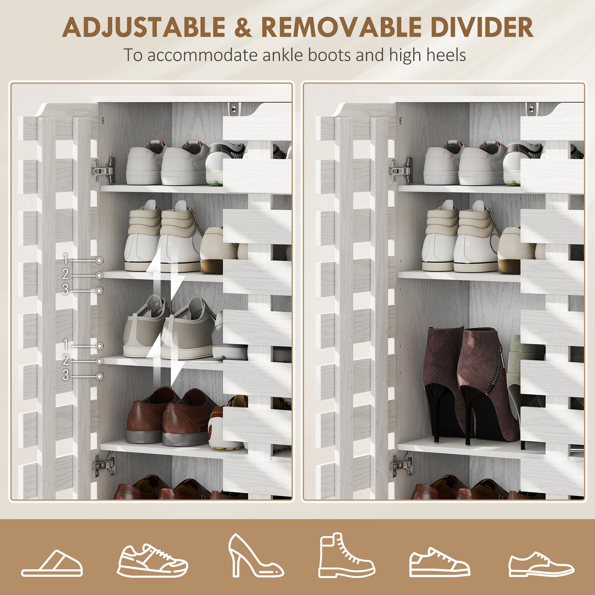 - • Three-level adjustable and removable shelves to fit room for boots and larger shoes