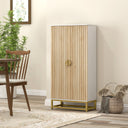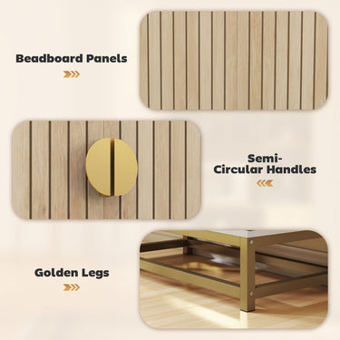 - • Elevate your kitchen with elegant tones, gold handles and beadboard panels