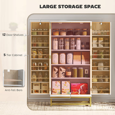 Picture a morning where every kitchen essential is at your fingertips, thanks to the HOMCOM pantry cabinet. With its multi-level shelves and door storage, chaos turns into calm, making your daily routine a breeze. The elegant design with gold handles and wood grain beadboards not only enhances your kitchen's aesthetic but also ensures safety with built-in anti-tipping hardware, offering peace of mind for your family.
