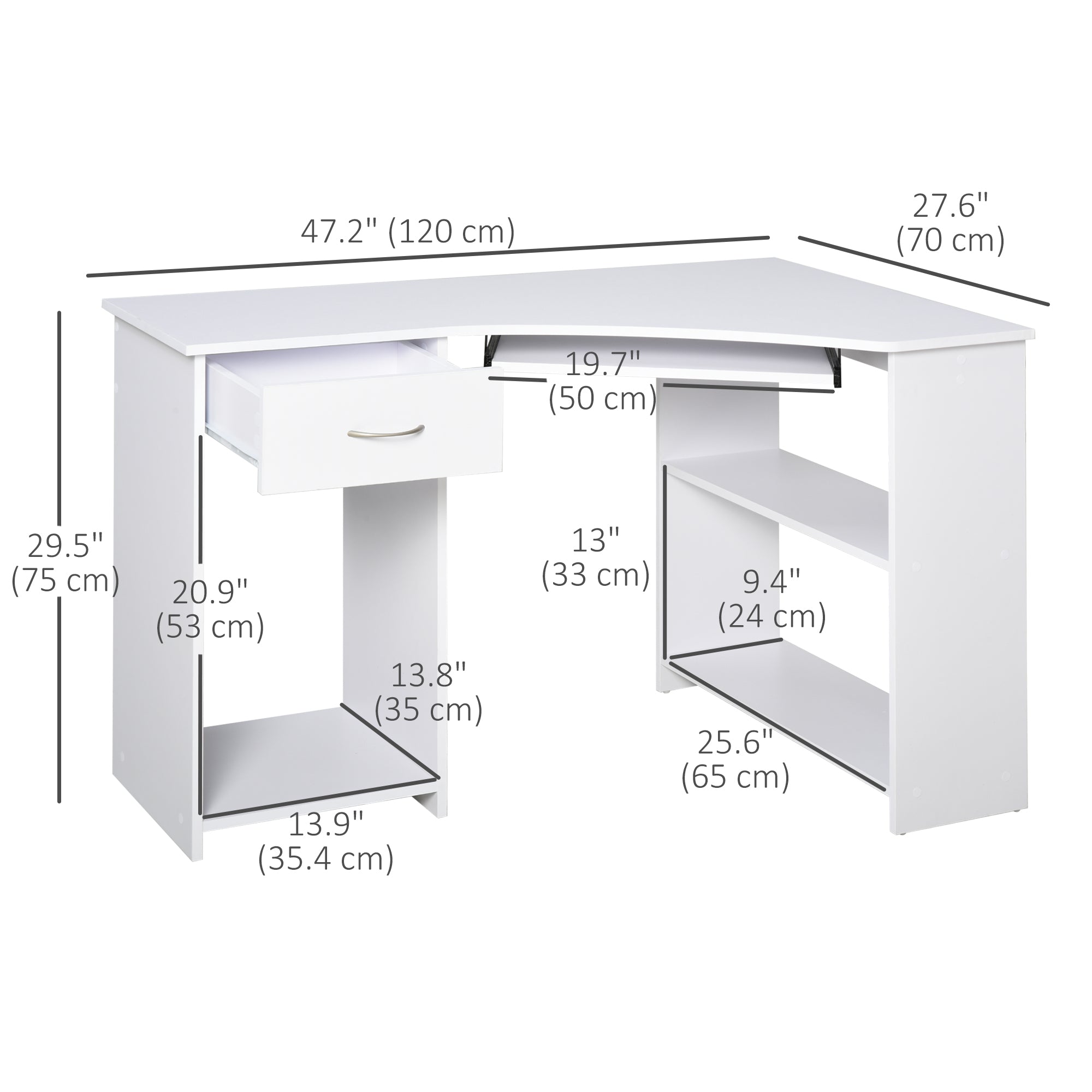 HOMCOM 47" L-Shaped Desk with Keyboard Tray, Computer Corner Desk for Small Space with Shelves, Drawer, CPU Stand, Home Office Writing Table, White