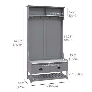 HOMCOM Coat Rack Shoe Bench, Hall Tree with Bench and Shoe Storage, Entryway Bench with 4 Hooks, 2 Drawers, 2 Shelves, Grey