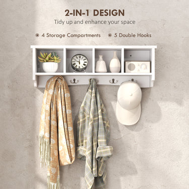 Transform your clutter into sophistication with the HOMCOM wall mounted coat rack with shelf! This clever 2-in-1 design features four storage compartments and five double hooks, maximizing your space stylishly. Great for any room, its simple yet chic appearance and functional design make it a must-have to keep your space tidy. Add a touch of convenience and style with this wall coat rack.