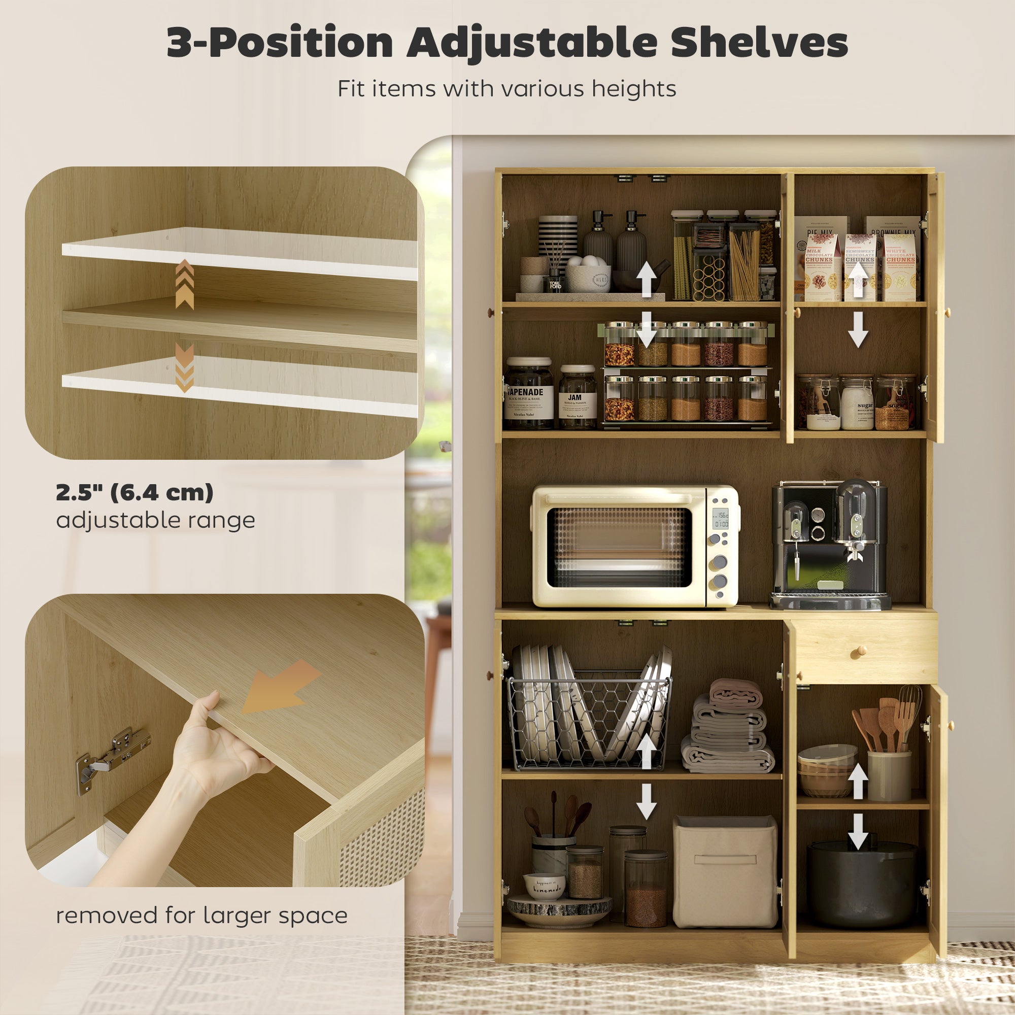HOMCOM Kitchen Hutch with Microwave Countertop, 71" Boho Kitchen Pantry Cabinet with Decorative Rattan Doors, Natural