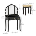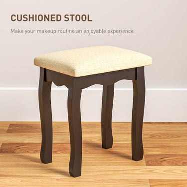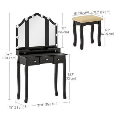 Transform your beauty routine with the make up vanity from HOMCOM, featuring a three-panel illuminated mirror with 10 removable LED lights (dimmable lighting and two clours: 3000 K warm light and 6500 K cool light) for flawless makeup application and paired with a cushioned stool for padded comfort. Keep all your cosmetics organized with multiple drawers and compartments. Treat yourself to this beautiful and essential piece - HOMCOM vanity desk with mirror and stool today.