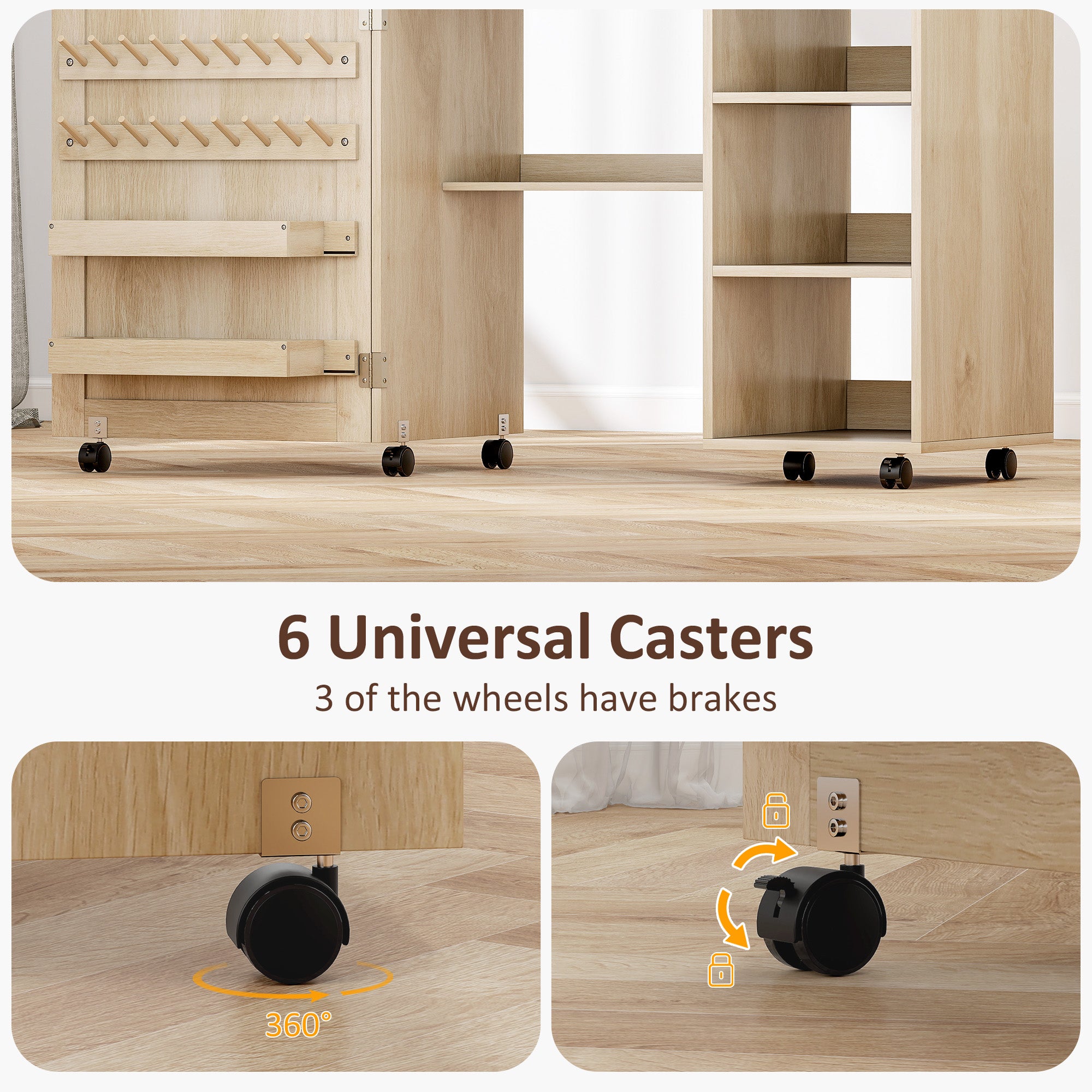 - • Six caster wheels for easy move, three lock in place for stability
