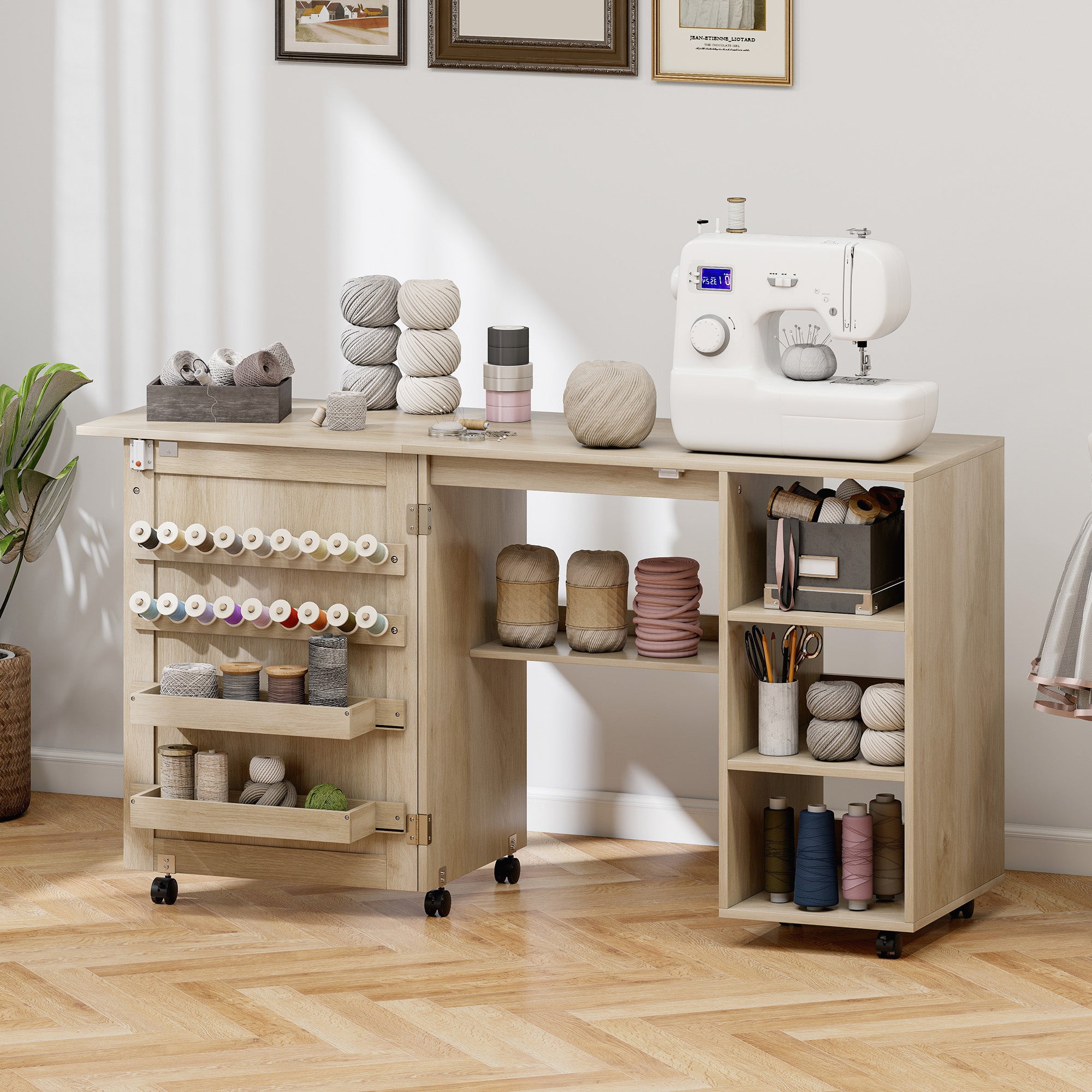 Struggling with a cluttered craft corner and limited room? Creative projects can feel chaotic when your supplies are scattered and your workspace dominates the room. The HOMCOM folding sewing table offers a solution. It features ample storage to organize your tools, a foldable top to save space, and lockable wheels for easy mobility. This craft table transforms any room into an efficient, adaptable creative haven, letting your inspiration flow freely.