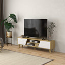 Simple, spacious storage comes in Scandinavian style - thanks to this HOMCOM TV table. The wood-effect body and white doors of this piece make it a forever-beautiful piece which effortlessly matches with your current furniture. It features two end cupboards and two middle shelves - plenty of room for media devices, movies, games and whatever else you need. The flat tabletop caters for screens up to 65". Media unit is complete with wooden legs for full support.