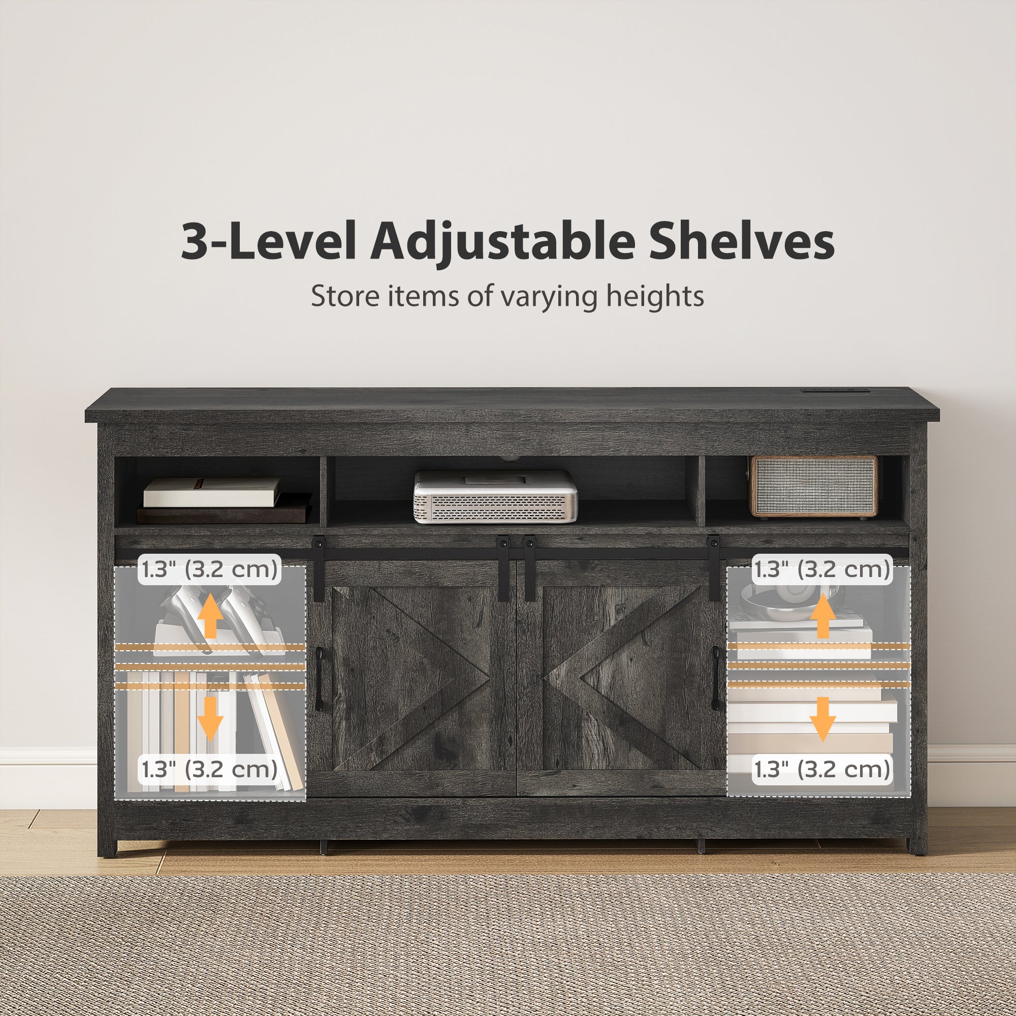 HOMCOM TV Stand with Power Outlets, Sliding Barn Doors and Adjustable Shelves for 72 Inch TVs, Dark Grey