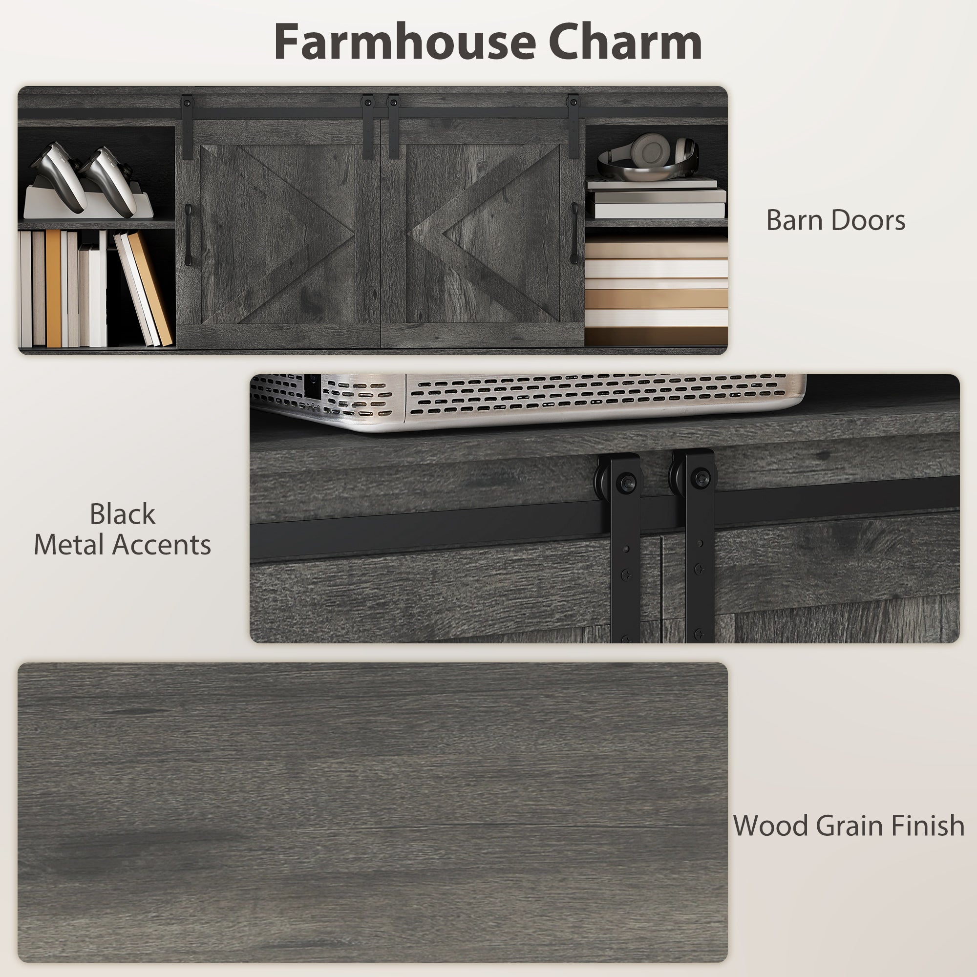 - • Barn doors and black metal accents add a farmhouse charm