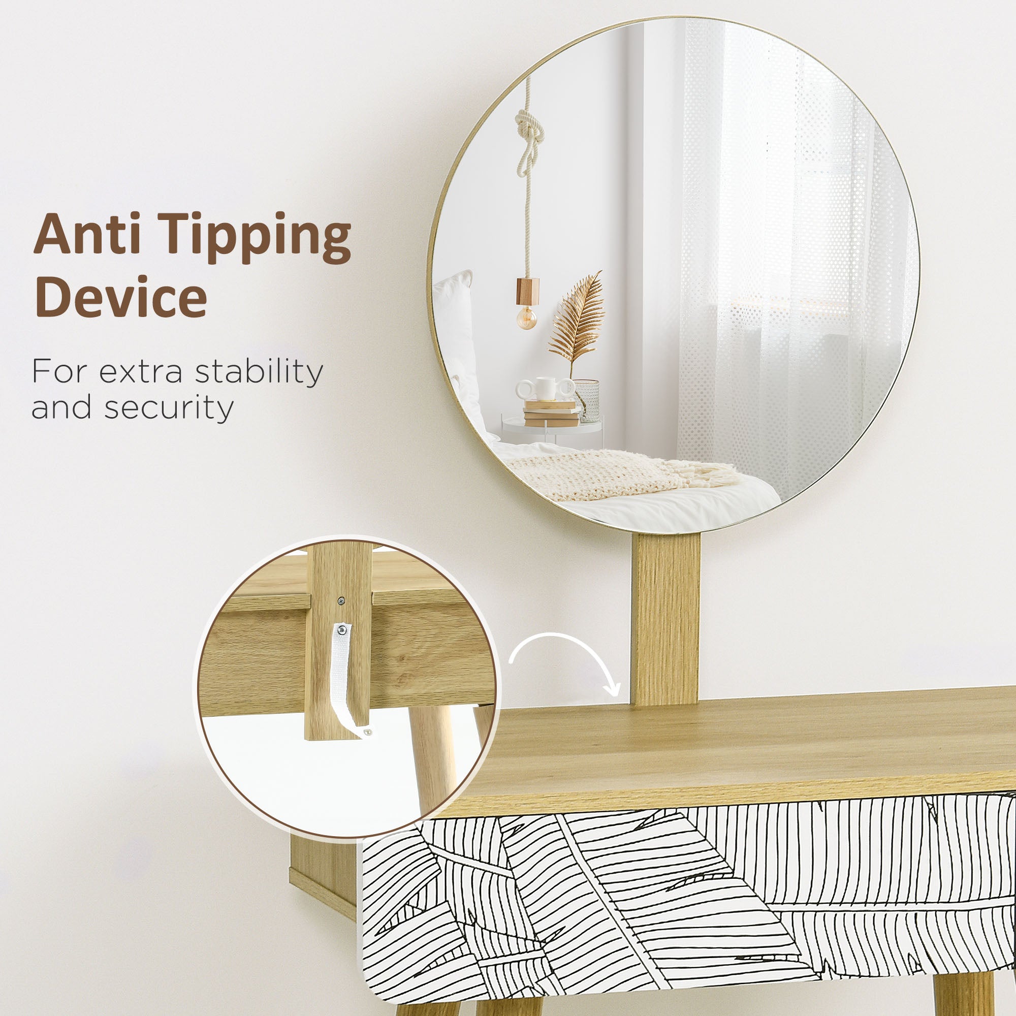 Bring beautiful and stand-out style into an everyday routine with this dressing table with mirror from HOMCOM. Features a pull-out drawer, keeping all your cosmetics, toiletries and makeup discreetly stored away and within easy reach. The tabletop also gives you lots of holding room when getting ready, with a round mirror allowing you to see your reflection easily. Four outward-angled legs keep this bedroom vanity balanced and stable, with pretty line patterning on the drawers to finish.