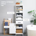 No more space for bathroom items? With this modern bathroom floor cabinet from kleankin, you can maximize space and minimize clutter. It is made into a slim tower design and can easily fit into tighter spaces. It features a 3-tier open shelf, a cabinet with shelf, and a drawer, providing plenty of room to store and organize towels, toiletries, and other items. Build an anti-toppling device on the back to prevent it from falling forwards. This kleankin cabinet makes your home chic and fresh.