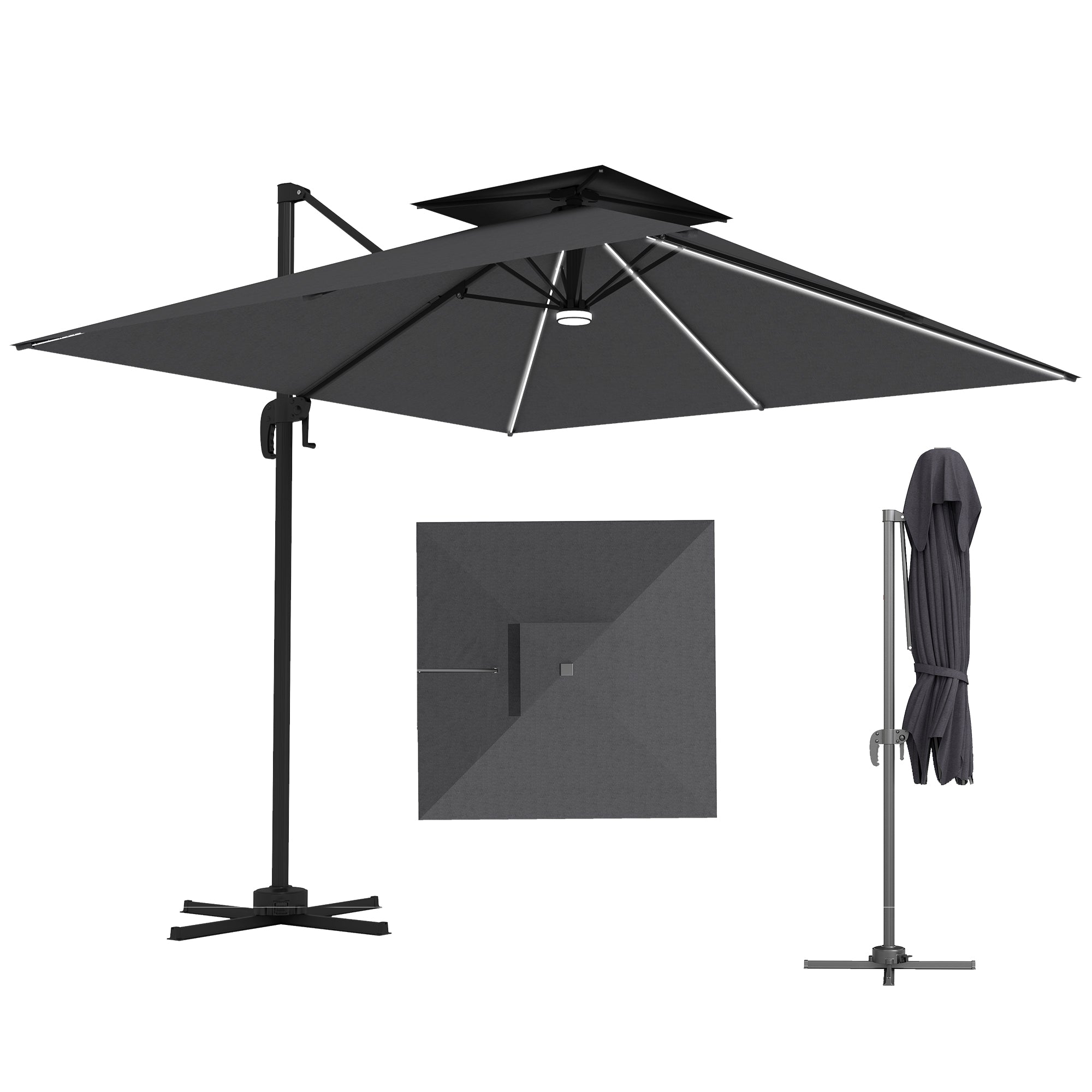 Outsunny 8' Cantilever Patio Umbrella with LED Lights, 360°Rotation, Tilt & Height Adjustment, Crank, Cross Base, Dark Grey