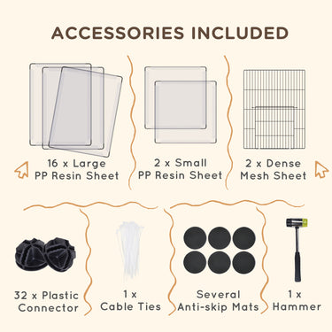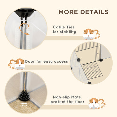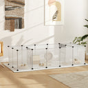 PawHut's pet fence provides a spacious and secure area for small pets. With 20 panels and 32 multi-angle connectors, it offers versatile configurations for compact and expansive spaces. Reinforced with additional clamps, the metal and PP resin framework ensures your pets' safety. It is well-suited for guinea pigs, hedgehogs, and other small animals.