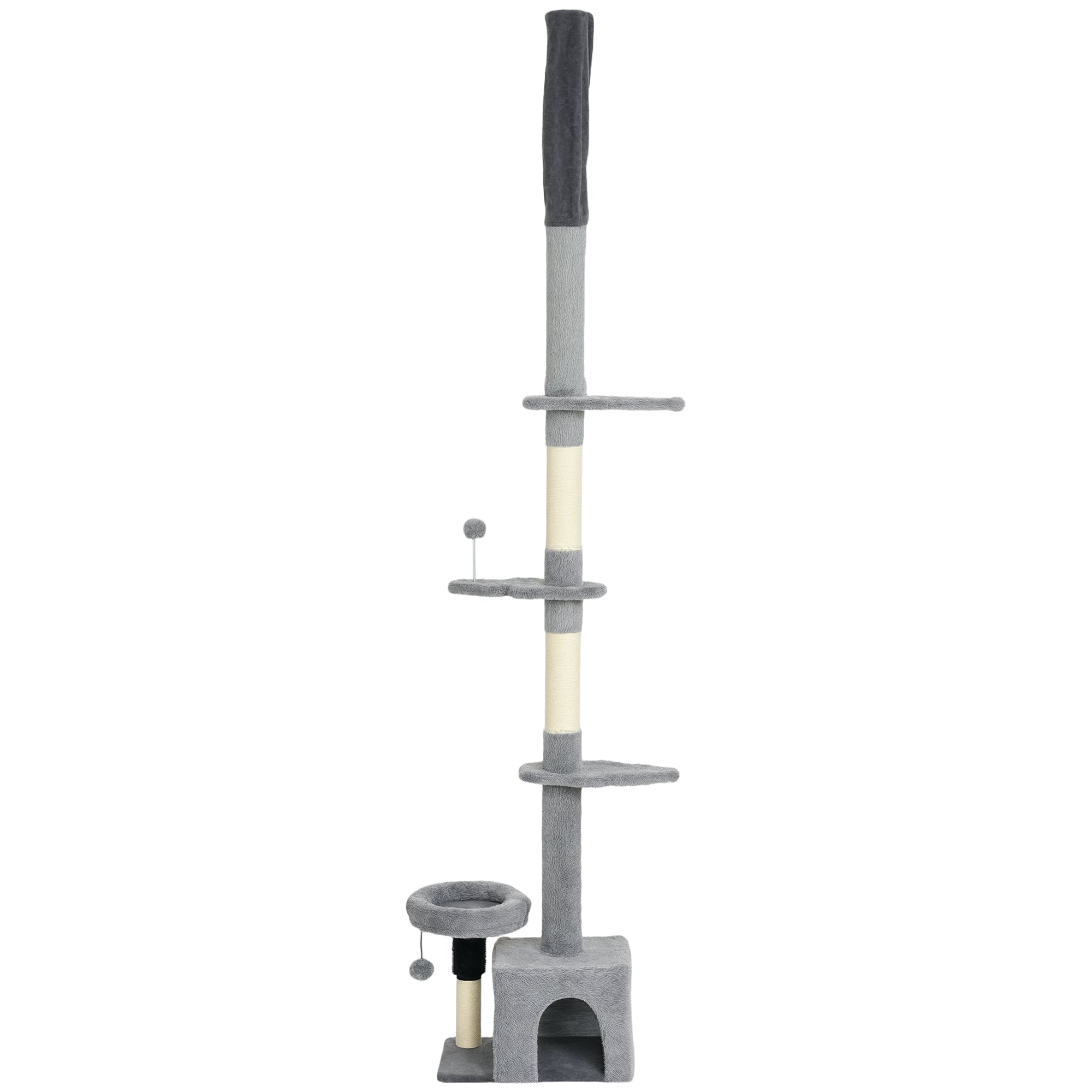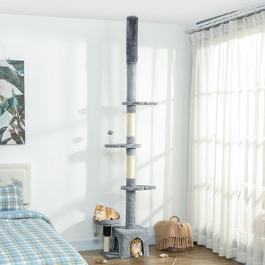 Create an activity centre for your cats with PawHut ceiling to floor cat tree. Featuring cosy resting spots, including a plush bed and snug condo, this cat tower offers plenty of space for climbing, lounging and exploring. Sisal-wrapped posts and a hanging toy keep cats entertained while satisfying their natural scratching instincts. The stable construction and safety features provide peace of mind, making it suitable for playful cats who love to stay active indoors.