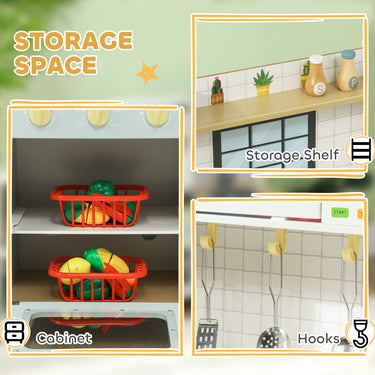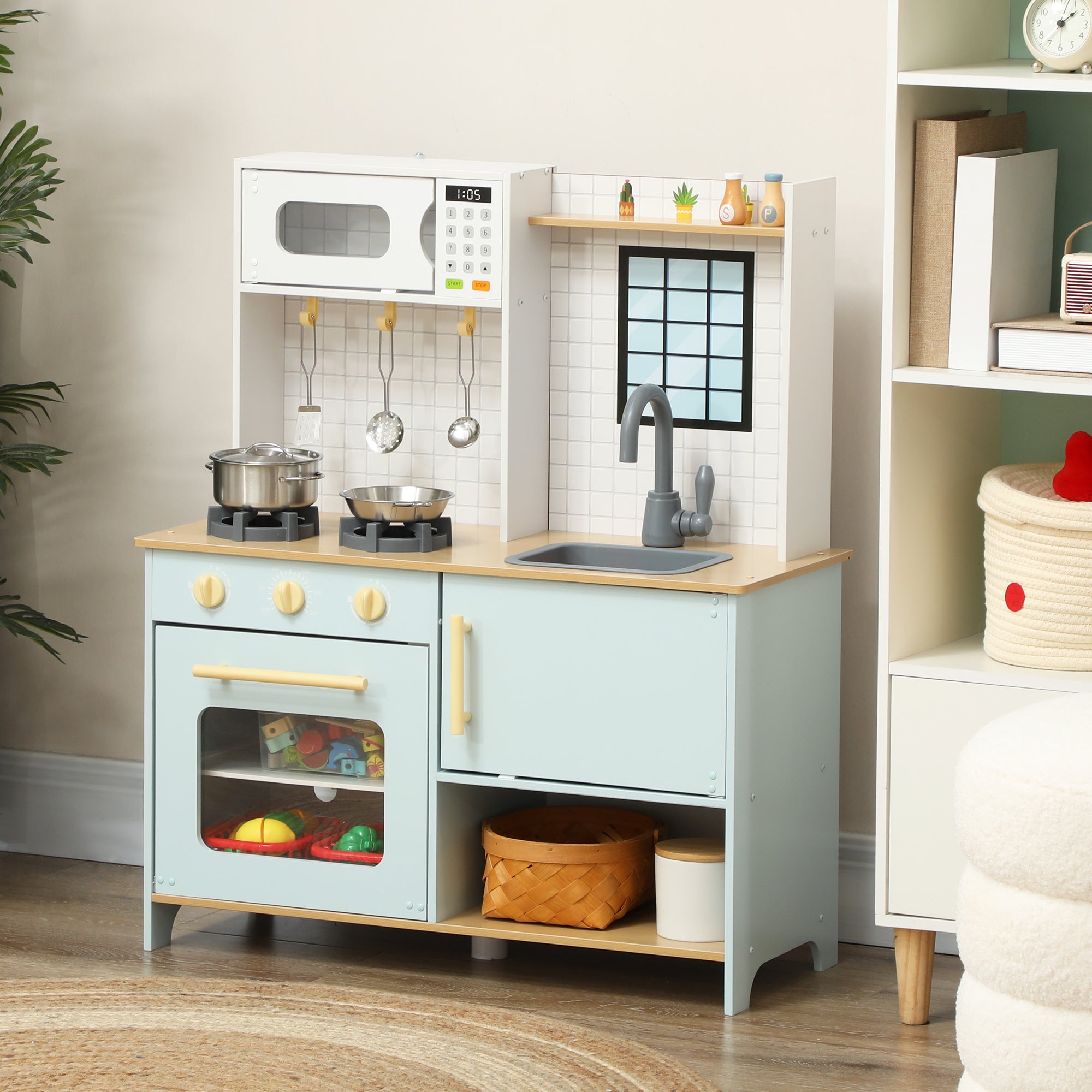 Unleash your child's culinary creativity with the Qaba play kitchen! Equipped with a stove, microwave, and oven featuring rotatable knobs, this kids kitchen set makes pretend play more realistic. It includes a five-piece stainless steel set for immersive fun, and ample storage space keeps all their kitchen tools tidy. Suitable for little chefs aged three and up to explore cooking in their own toy kitchen.