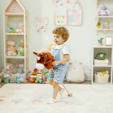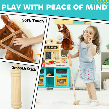 Tired of finding toys that are safe and engaging for both indoor and outdoor play? This Qaba hobby horse brings adventures to life. With a tap of its ear, realistic galloping sounds fill the room, sparking imagination. Crafted with soft fibre and a solid wood stick, it brings peace of mind during energetic play. The smooth wheels glide from the living room to the garden, making this horse on a stick a year-round companion.