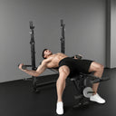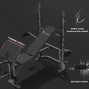 - • Adjustable gym bench and barbell rack cater to various exercise needs