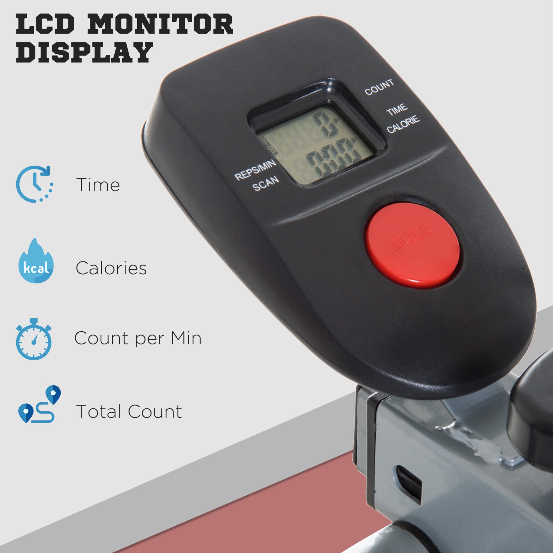 - • LCD monitor tracks calories, time and distance, allowing you to keep goals